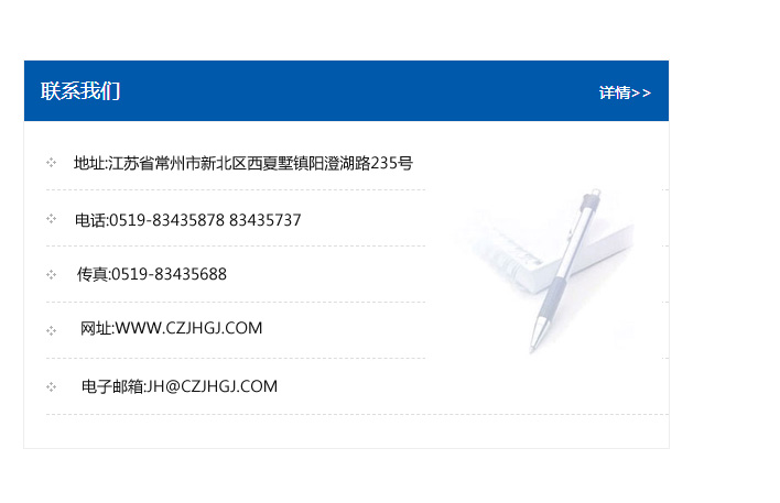 傳真:0519-83435688    郵編:213135    網址:WWW.czjhgj_com.jswfggc.com    電子郵箱:JH@czjhgj_com.jswfggc.com
